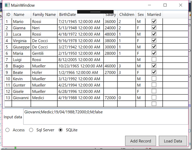 Nello StackPanel ove precedentemente erano i 3 Button che caricavano i dati dai 3 diversi database, ora abbiamo 2 soli Button, uno per caricare i dati, l’altro per aggiungere i record al database selezionato tramite i radiobutton.